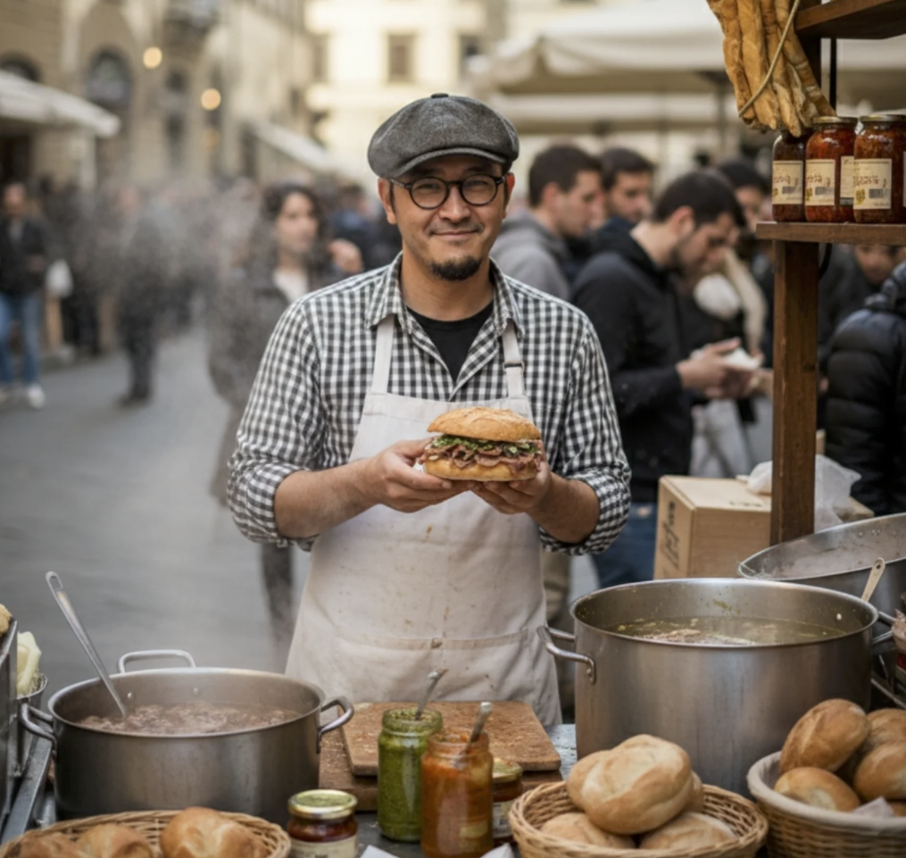 写真はシェフのフィレンツェでのランプレドット屋台修行時代。(嘘)